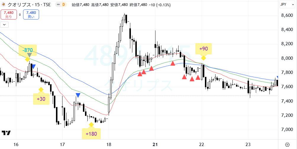 【2025年4月23日】(4897)(クオリプス)を利益確定しました。(プッシュアロー・アドバンス)