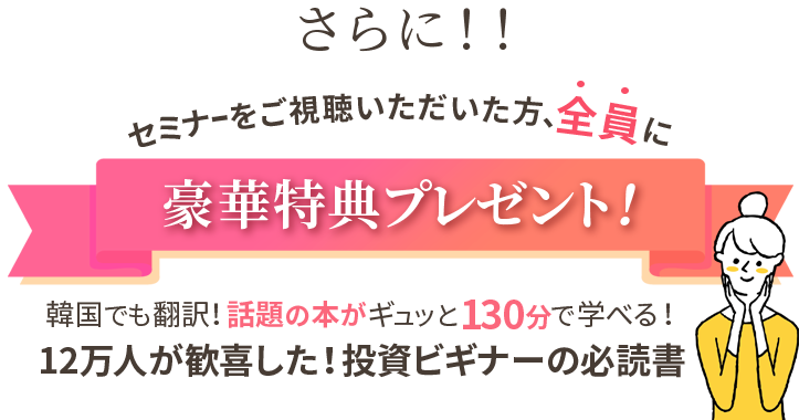 この勉強会動画は、「投資1年目の教科書」の理解を深めることができる約130分の充実した内容です。投資が初めての方でもわかりやすく、投資家としての心構えから、投資とトレードの違い、チャート、移動平均線、波動などを学ぶことができます。その勉強会動画を今回、セミナーをご視聴頂いた方、全員に特別にプレゼントいたします。