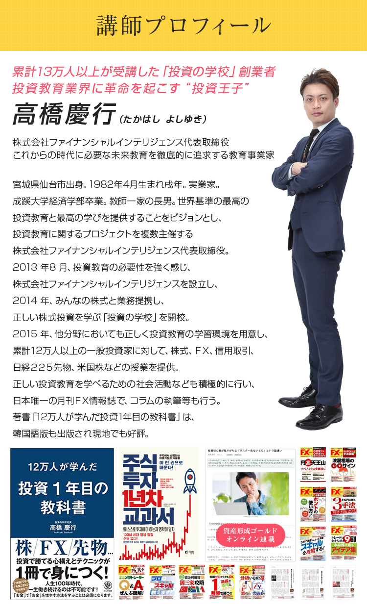 2013年10月に創業した株式会社ファイナンシャルインテリジェンスが運営する投資教育の専門学校です。対面講座とオンライン講座、個別指導、デジタルテキストやメール講座などを通じて、東京を中心に、関東、関西などで授業展開をしています。受講者のレベル別、目的別、投資用資金別、将来のライフプランや現在の職業や家族構成などによっても、投資の方針はさまざまに変わるものなので、ひとりひとりが自分に合った投資法を発見できるように、総合的なサポートを行っています。