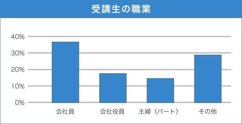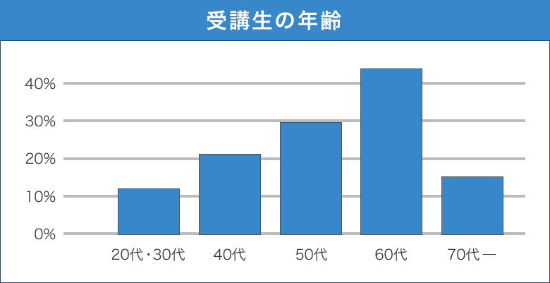 20代、30代が最も割合が少なく、40代から60代で大多数の割合を占めるのが当学校の特徴となります。2013年の創業以来この傾向は変わりません。
