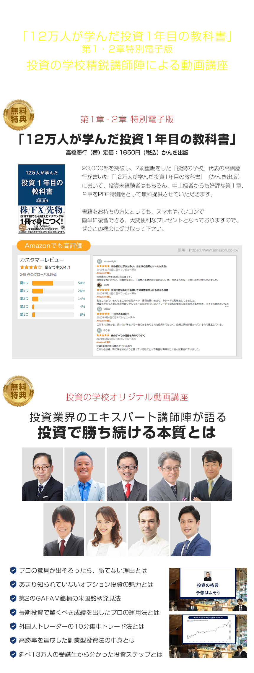 「投資の学校」は、これまで、時代に即した投資のやり方・教養を、初心者にもわかりやすく、真面目に、そして時に面白く、オンライン動画で提供してきた実績があります。